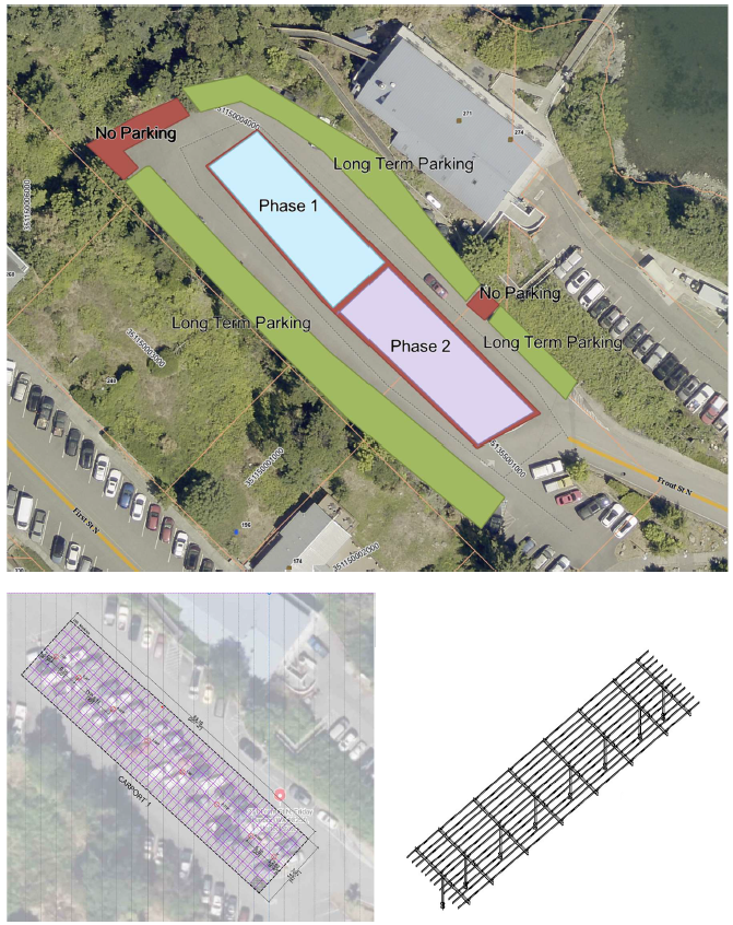 The project which will receive final construction permits this week will enable the Port to construct an overhead solar canopy in the Friday Harbor Marina’s upper parking lot. The canopy will be constructed as covered parking, allowing for dual function, a covered car port and a permanent addition to the Ports electrical grid. The solar canopy can produce 200kw of power, generating clean, renewable energy for Port operations and supporting the Port’s sustainability and electrification goals.